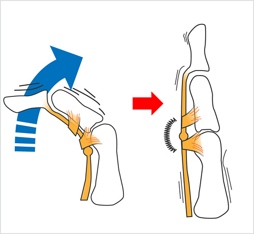 多くの場合、手の使いすぎから腱(指を曲げ伸ばしするための強い組織)と腱鞘(腱を押さえる鞘)の摩擦によって炎症が起こり、さらに進行して腱が部分的に太くなってしまうために、ばね現象が起こると考えられます。