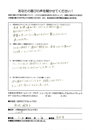 その日の施術で痛みが軽くなり、産後つらかった痛みがうその様にらくになりました。