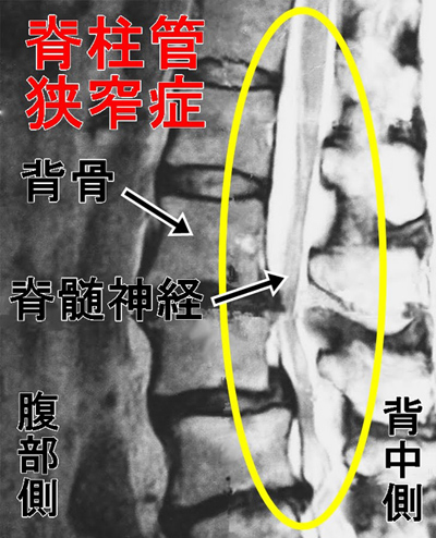 脊柱管狭窄症は、脊柱管(背骨の後ろ側にある脊髄神経が通るトンネルのような部分)が何らかの原因で狭くなり、脊髄神経が圧迫されて、腰であれば、坐骨神経痛や間欠はこう(繰り返し歩きにくくなったり歩けるようになったりする状態)や腰の痛みが現れます。